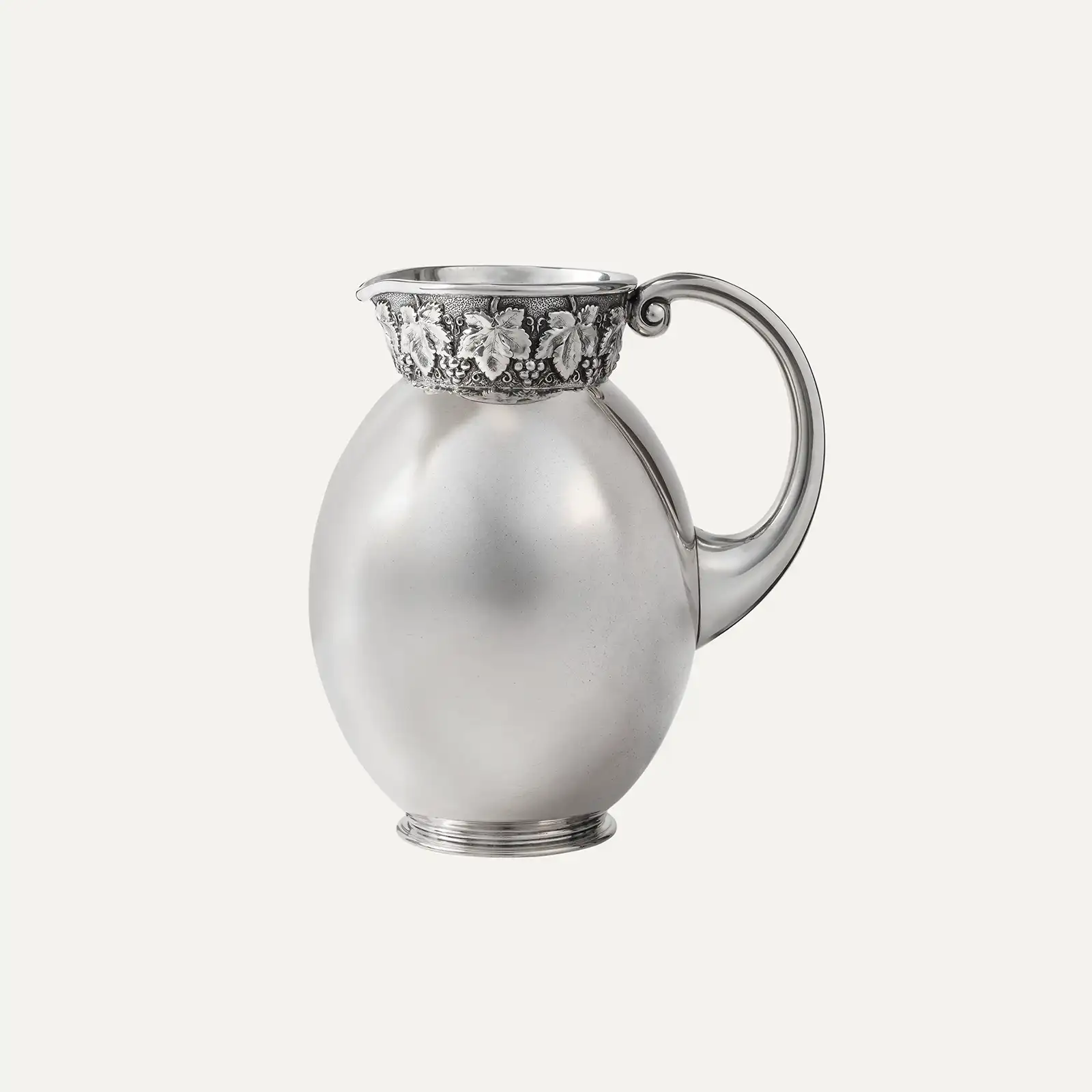 Jarro de água em prata portuguesa 833 ‰, finamente decorado com uma barra em relevo representando folhas, parras e cachos de uvas. A pega lisa confere equilíbrio e sobriedade ao conjunto, realçando a riqueza do trabalho decorativo. Apresenta marcas de contraste do Porto (Javali, 1887–1937) e marca de ourives do Porto José Gil Y Poy (1917–1969), testemunhando a autenticidade e o valor histórico da peça.