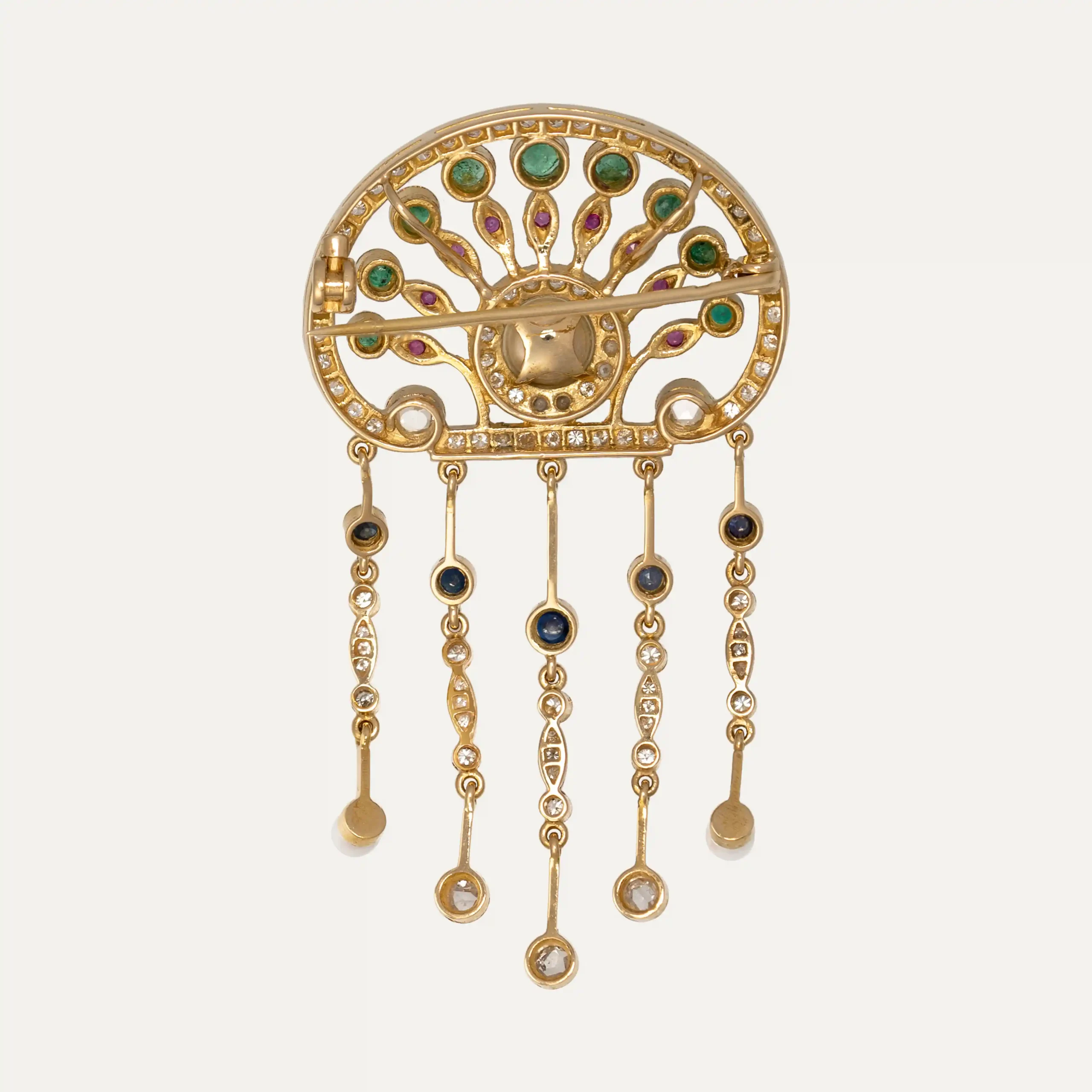 Pendente/alfinete em ouro amarelo 19.2kt – 800‰, cravejado com 79 diamantes talhe antigo, 9 esmeraldas, 9 rubis, 5 safiras e 3 pérolas.