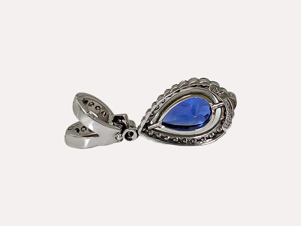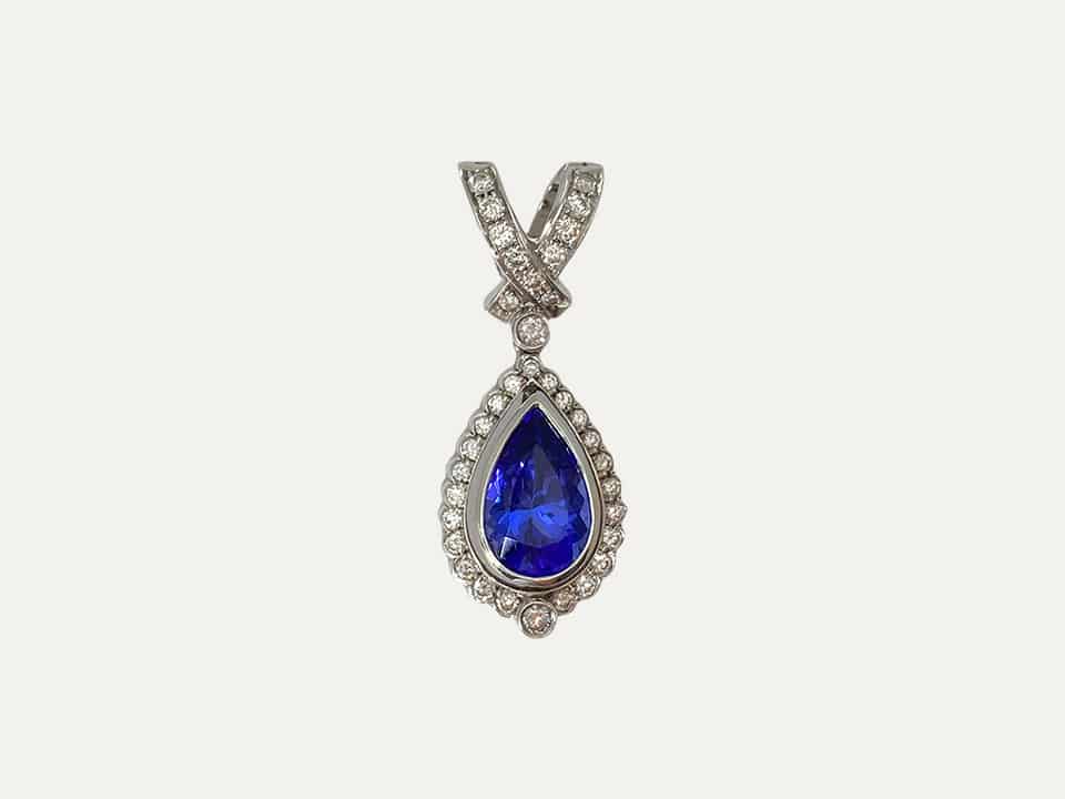 Pendente J. Friedman em ouro branco 18 kt – 750 ‰ com uma tanzanite azul royal, em forma de gota, facetada e rodeada de brilhantes. A argola do pendente abre para permitir usar facilmente em qualquer colar.