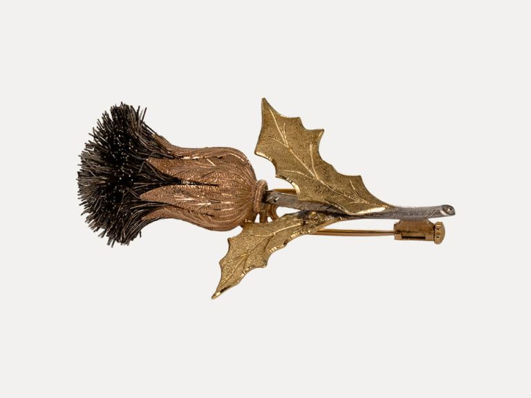 Pregadeira Buccellati em ouro rosa/amarelo 18 kt – 750 ‰ e prata, em forma de flor de cardo, circa 1960. Estrutura do fecho em ouro rosa com pino duplo. Assinado Mario Buccellati