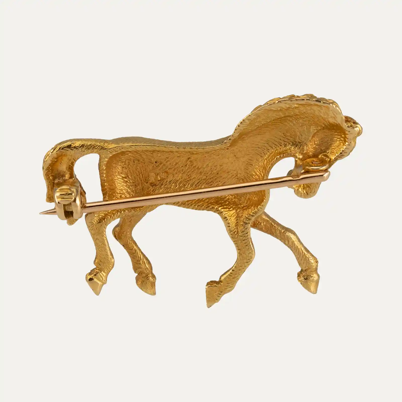 Pregadeira em forma de cavalo em ouro amarelo de 19.2kt – 800‰, posição dinâmica do cavalo em movimento. Acabamento cinzelado realça os detalhes anatômicos que proporcionam textura e profundidade.