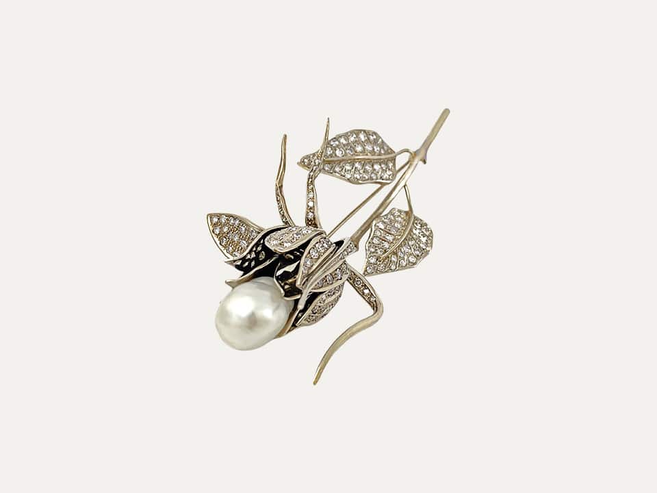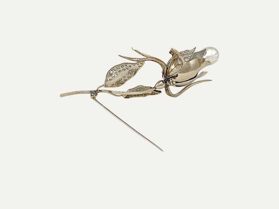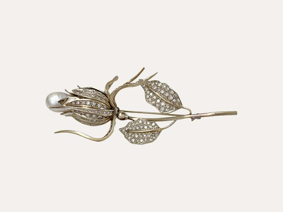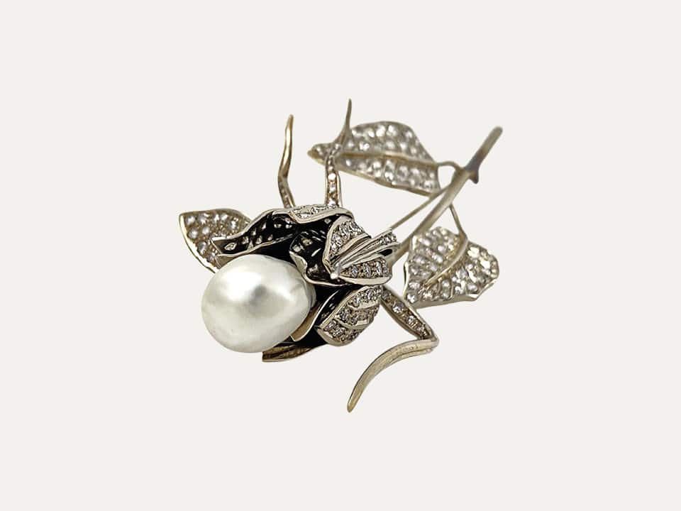 Pregadeira / alfinete em forma de flor, em ouro branco de 19 kt – 800‰ com 1 perola em forma de gota e brilhantes