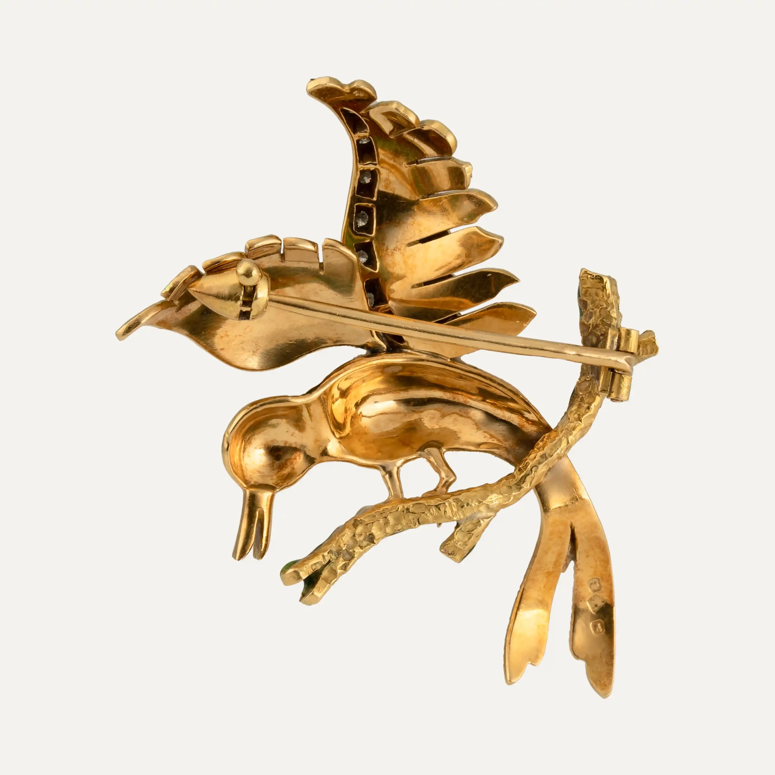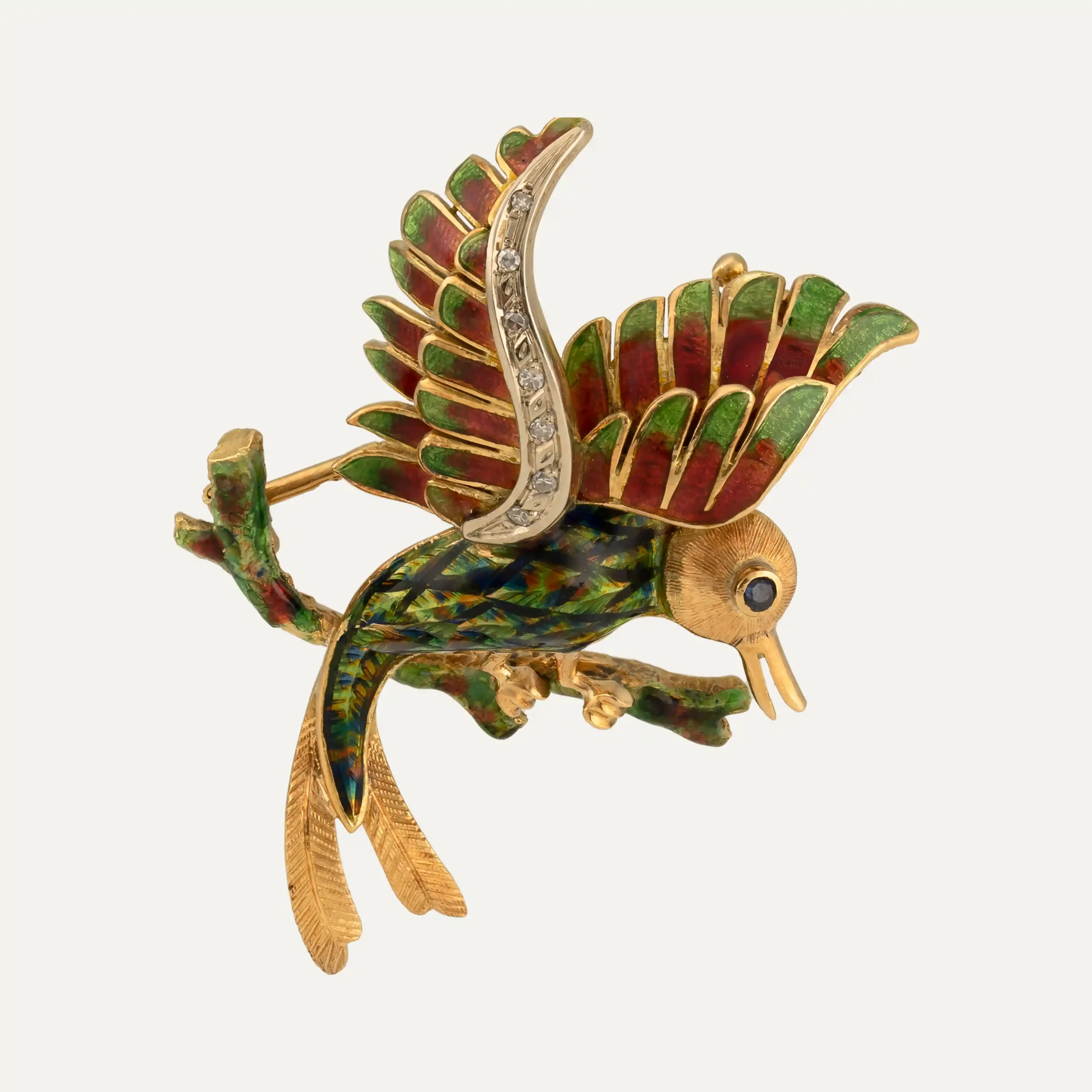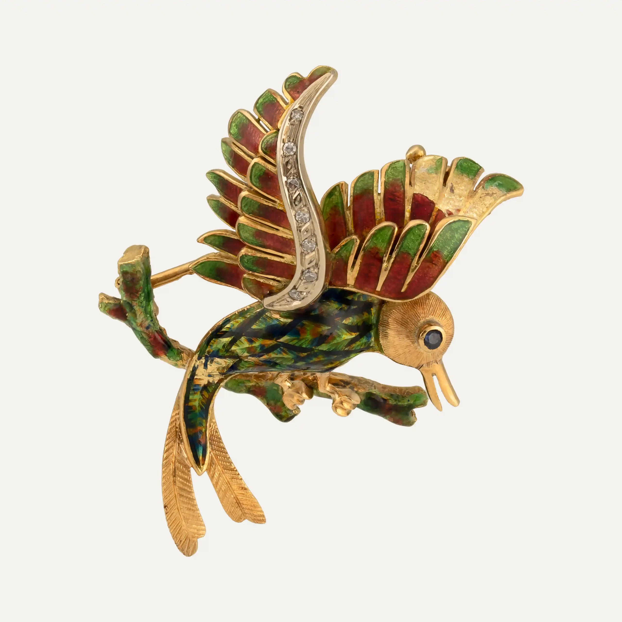 Antiga pregadeira em forma de pássaro, em ouro amarelo de 19.2kt – 800‰, asas cravejadas com 7 diamantes com cerca de 0.035ct no total, cabeça cravejada com 1 safira azul. Corpo e assas cobertas com esmalte de diversas cores.