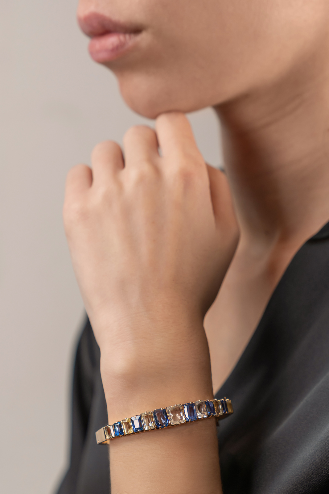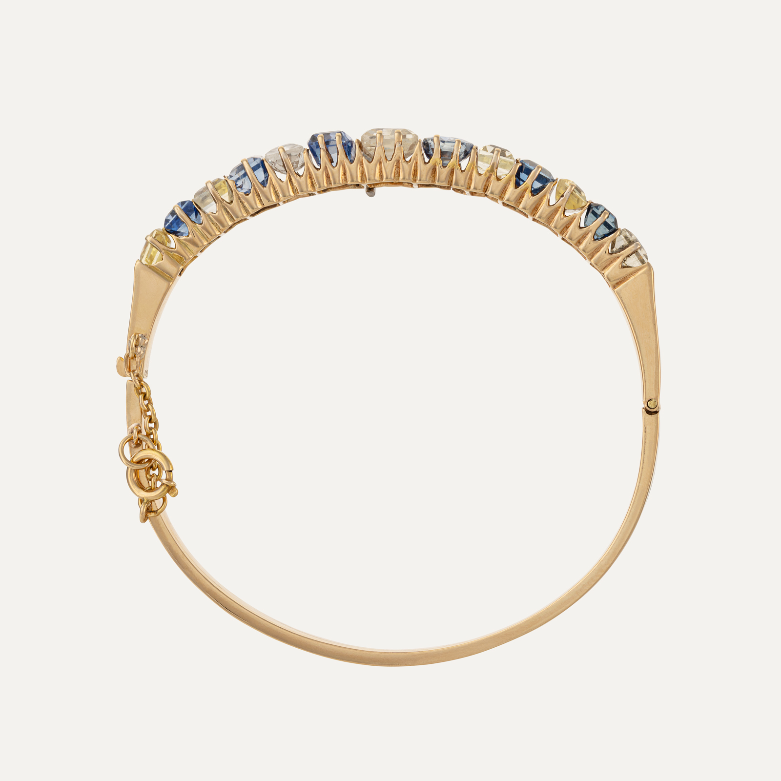 Pulseira rígida, ouro amarelo de 19.2 kt – 800 ‰, cravejada com 6 safiras azuis e 7 amarelas que totalizam cerca de 16,8 ct. Com 6 cm de diâmetro interno e corrente de segurança. Portuguesa, com contraste de Lisboa (1938-1984) e marca de ourives ilegível.