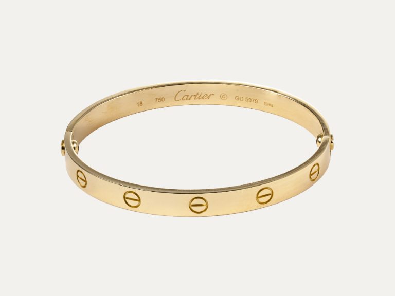 Pulseira LOVE da Cartier, em ouro amarelo 18 kt – 750 ‰. A pulseira LOVE é um ícone do design de joalharia: uma pulseira oval ajustada composta por dois arcos rígidos que se usa no pulso e se retira com uma chave de fendas específica.