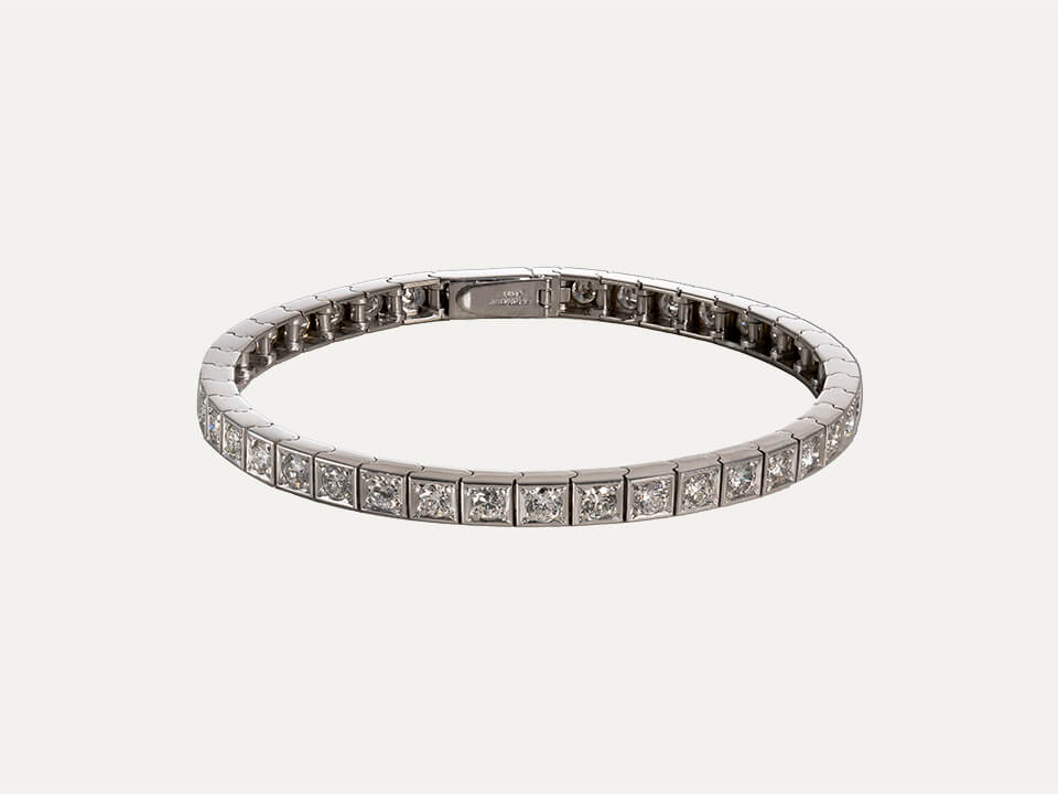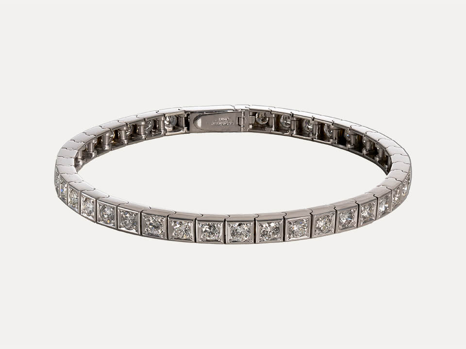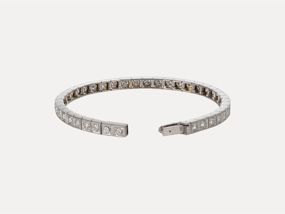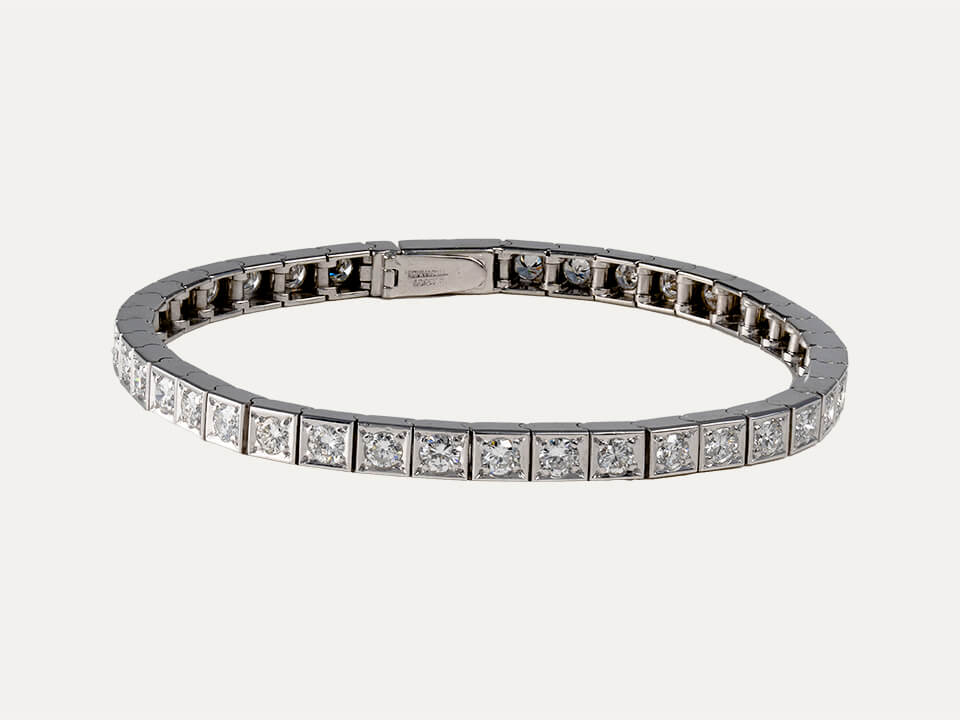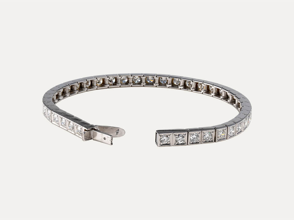 Pulseira riviera em ouro branco de 18kt – 750‰ com 40 diamantes, em talhe brilhante, com cerca de 4ct no total. Comprimento total da pulseira 18cm. Com fecho de segurança.