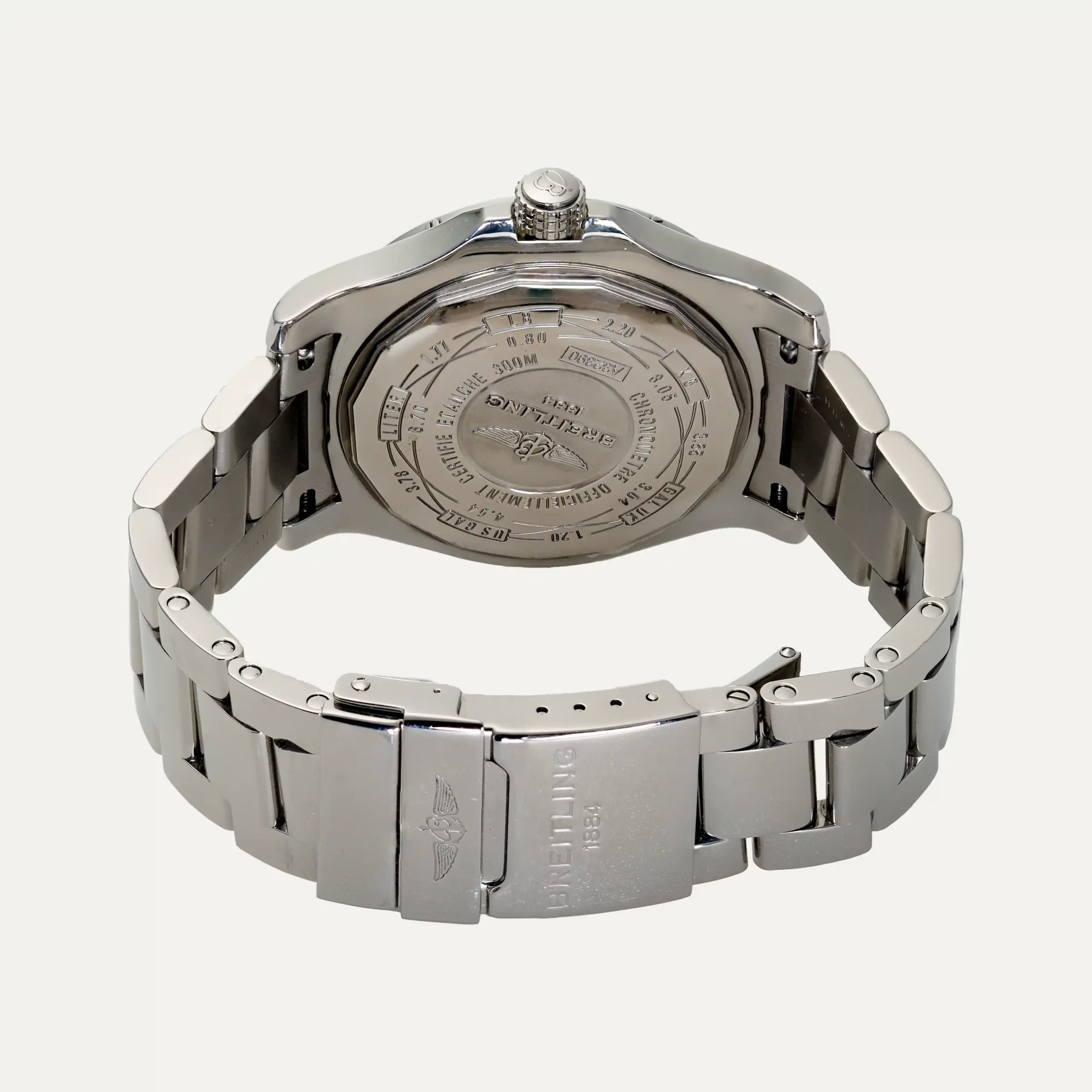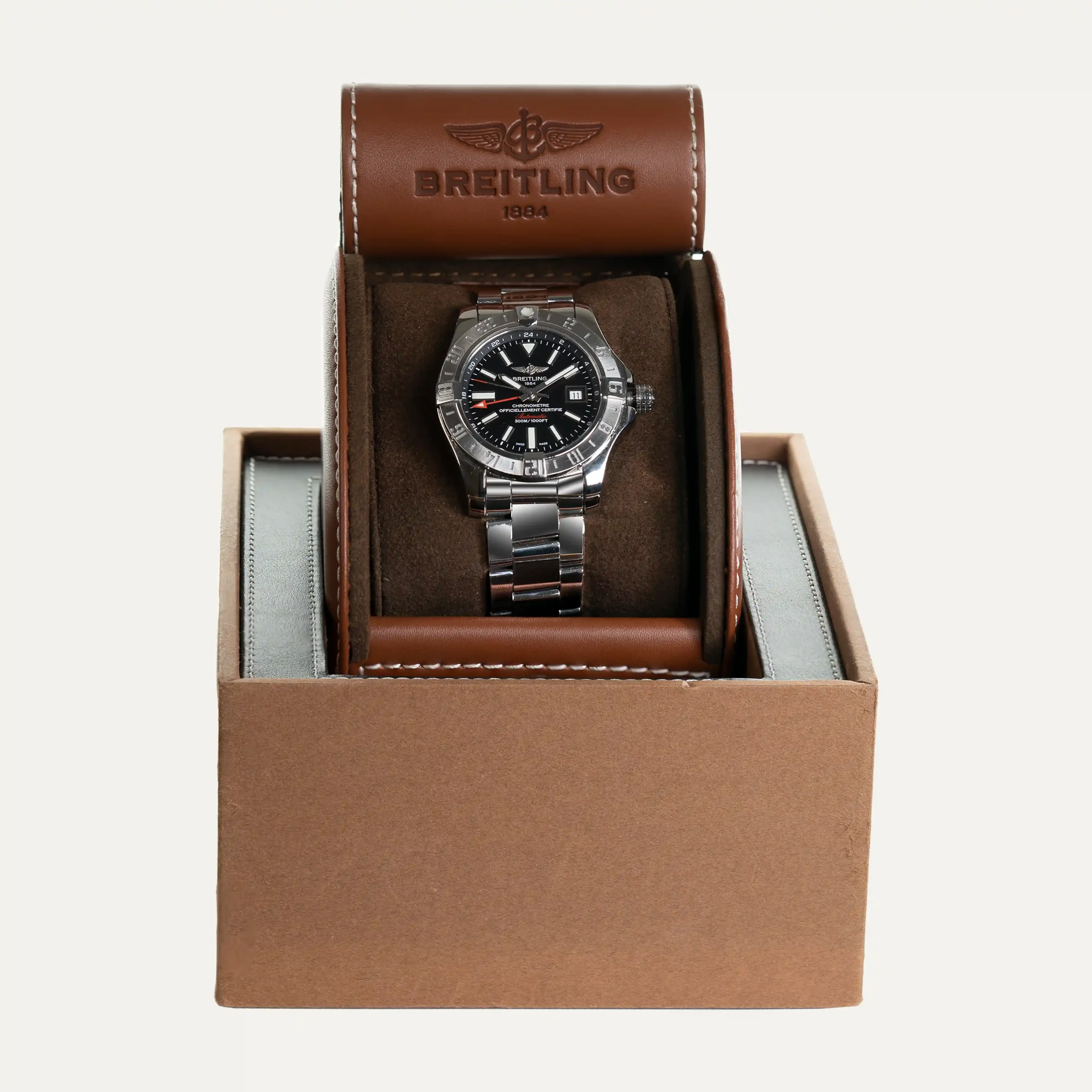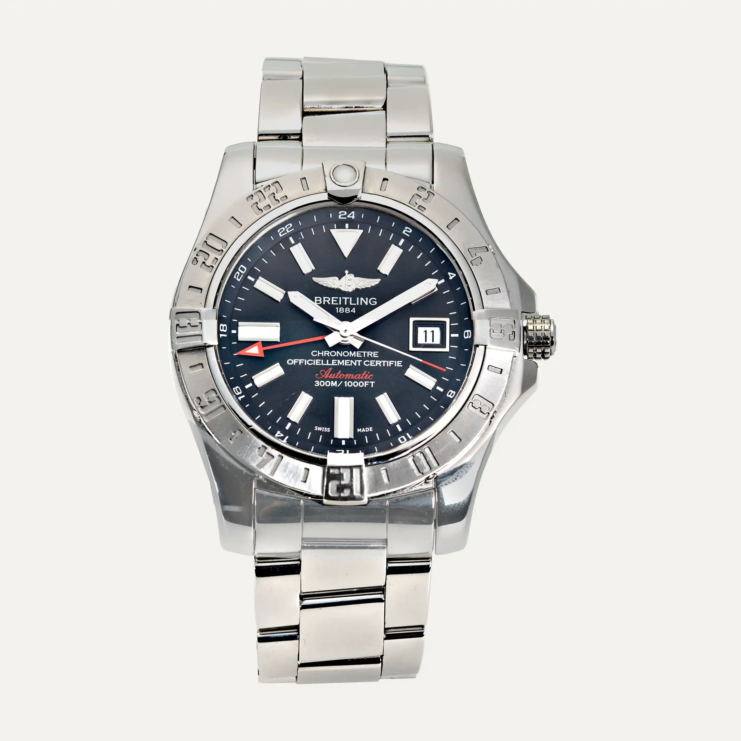 Relógio Breitling Avenger II GMT, movimento automático, caixa em aço, com 43mm de diâmetro e espessura 12mm. Mostrador preto com index com data às 3 horas, ponteiros luminescentes de horas, minutos e GMT. Coroa de rosca com reserva de marcha de 42 horas. Lunete rotativa bidireccional com uma graduação de 24 horas utilizado como um 3º fuso horário. Vidro de safira. Bracelete em aço com dobra dupla. Certificado COSC. Caixa Breitling e documentos. Este relógio é apoiado pela nossa garantia de um ano.