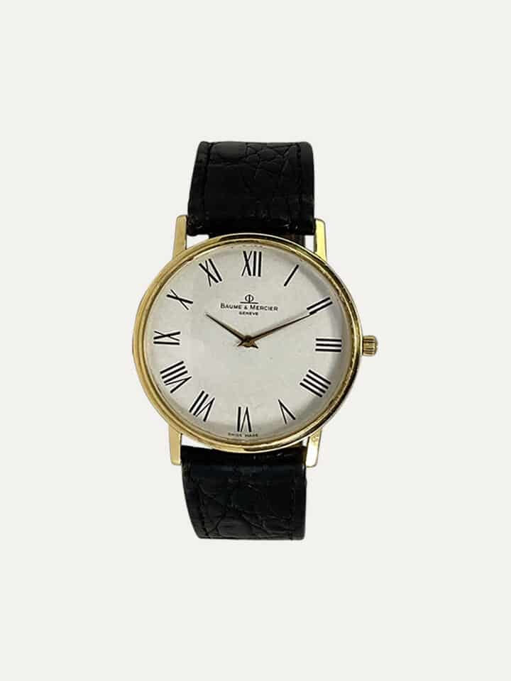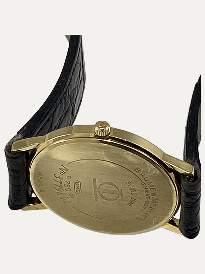 Relógio de pulso unisexo Baume & Mercier, Classima Ultra Thin, ref MV045088, com caixa em ouro 18 kt – 750 ‰, com 32 mm excluindo coroa, vidro mineral, mostrador branco com algarismos romanos, coroa Baume & Mercier original, pulseira de couro preto Baume & Mercier original, fivela Baume & Mercier folheada a ouro, movimento de quartzo. Peso 25,55g. Revisto e em excelente estado de conservação.