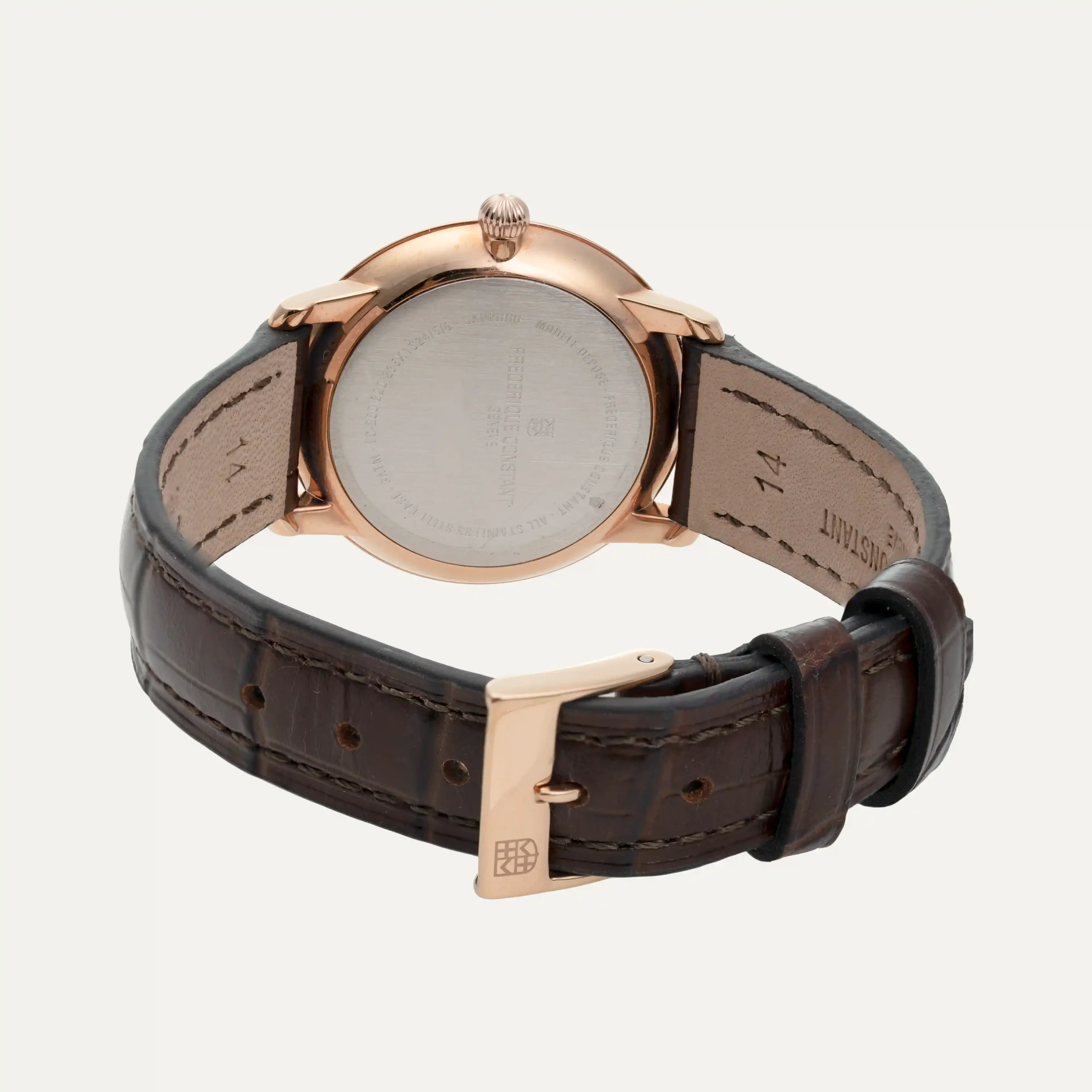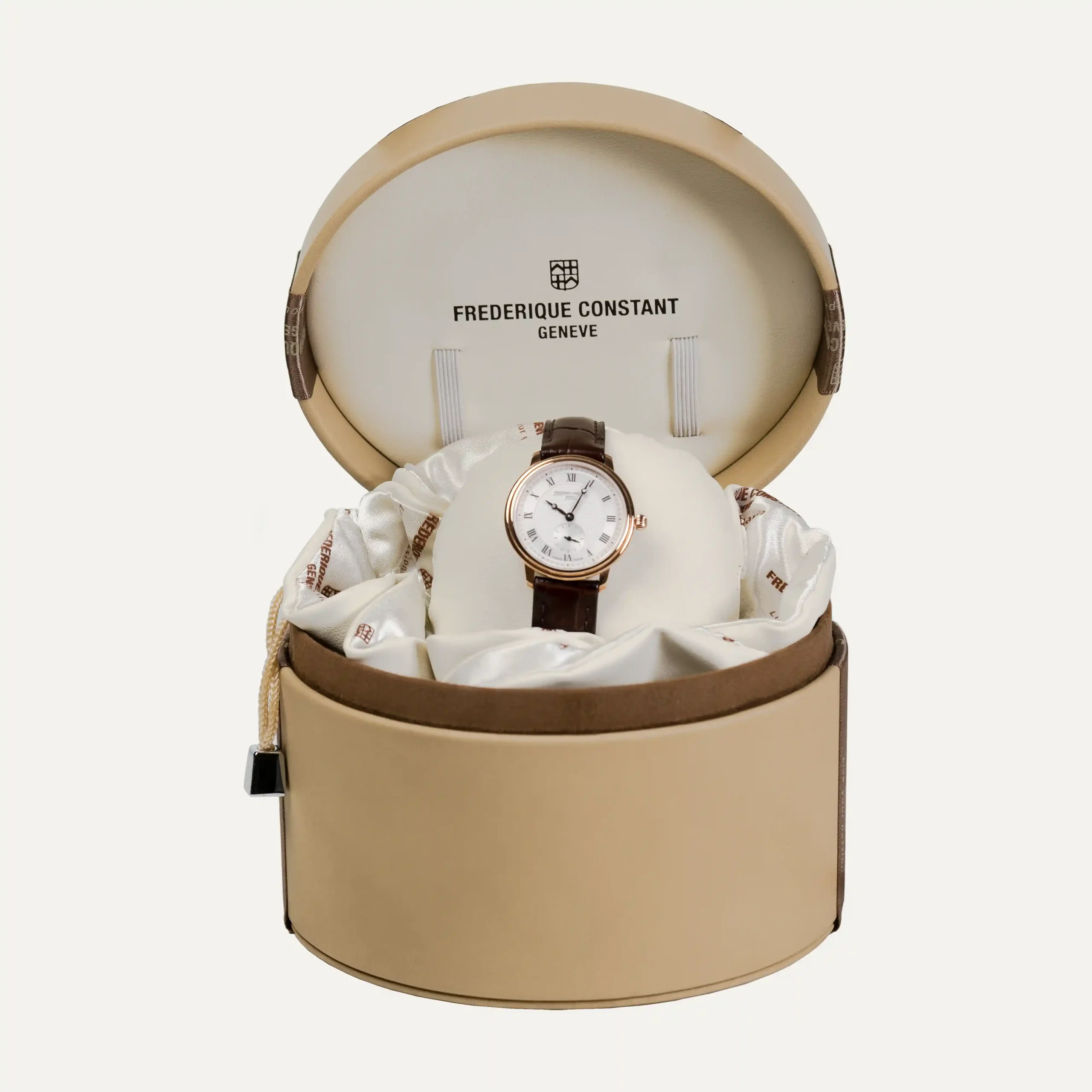 Relógio Frederique Constant Slimline, movimento de quartzo, caixa em aço/rosa com 28,6mm de diâmetro e espessura 5mm. Ponteiro de horas e minutos e segundos às 6 horas. Mostrador prata com guilhoché, numeração romana. Vidro de safira. Bracelete em pele de vitela com estampa de crocodilo, fivela original em aço/rosa. Caixa Frederique Constant e documentos. Este relógio é apoiado pela nossa garantia de um ano.