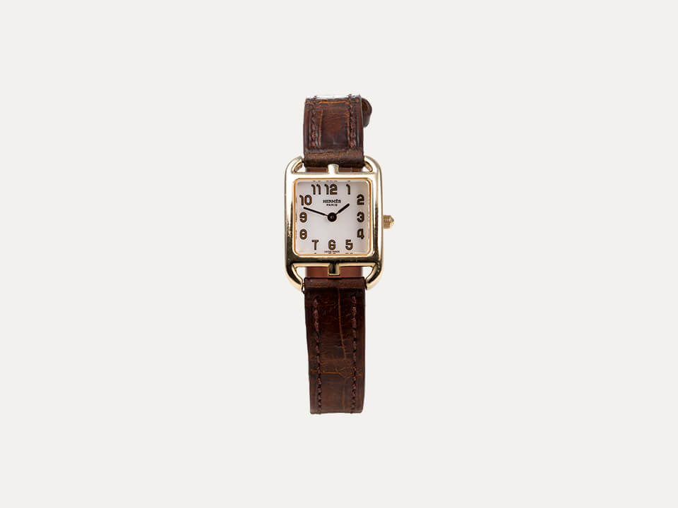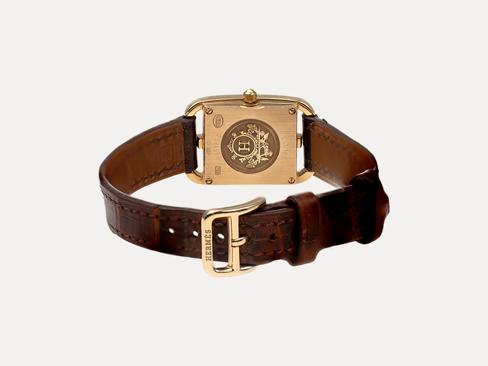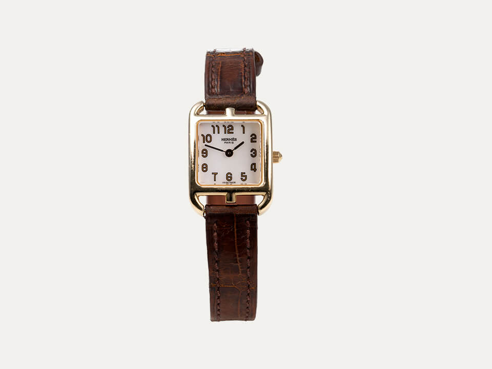 Relógio Hermès Cape Cod, movimento de quartzo. Caixa em ouro amarelo 18kt – 750‰, com 19mm e 6mm de espessura. Mostrador em madre perola branco com algarismos árabes. Ponteiro de horas e minutos. Vidro de safira antireflexo. Bracelete em pele exótica castanho (crocodilo), fivela em ouro amarelo original. Caixa Hermès e documentos. Ano 2008. Este relógio é apoiado pela nossa garantia de um ano.