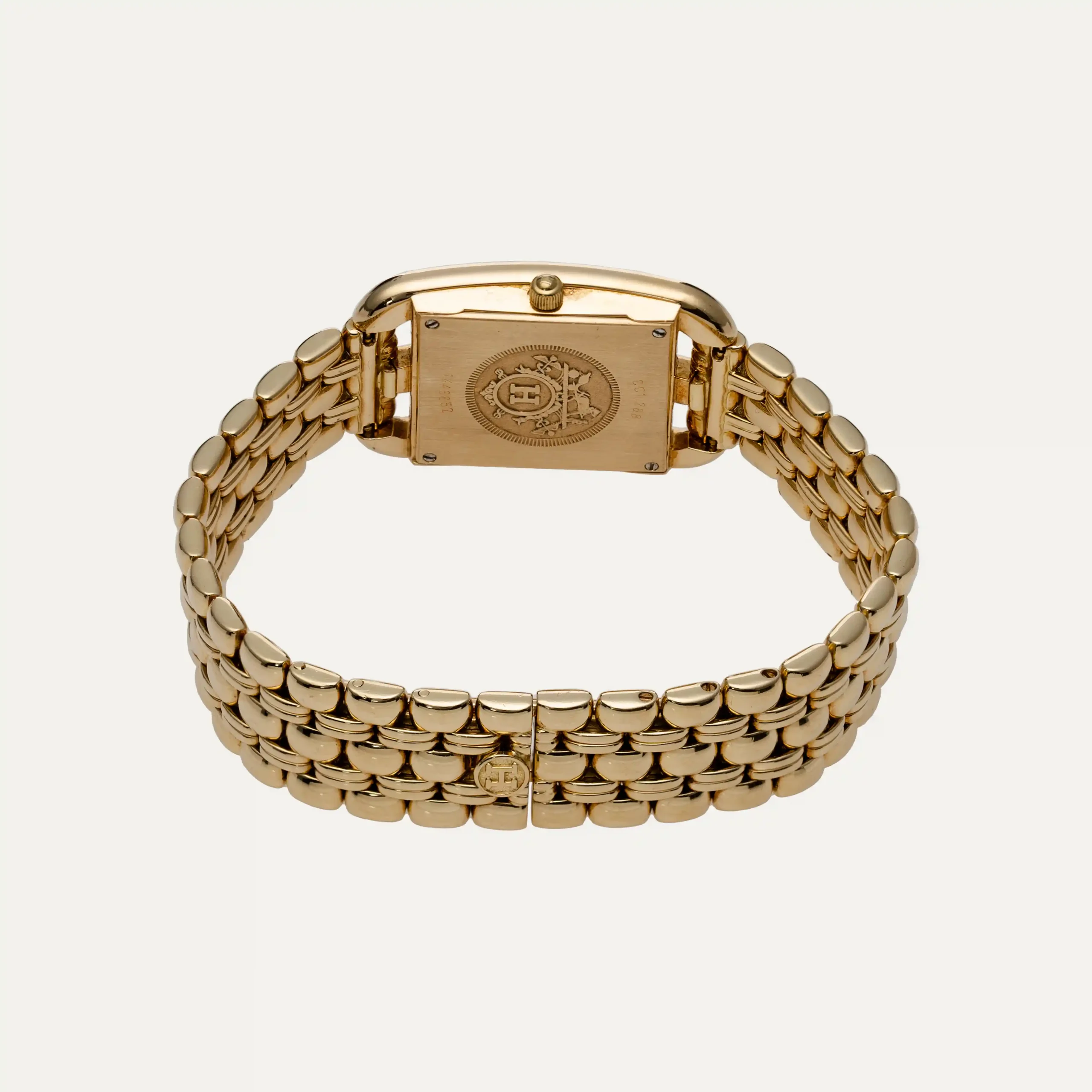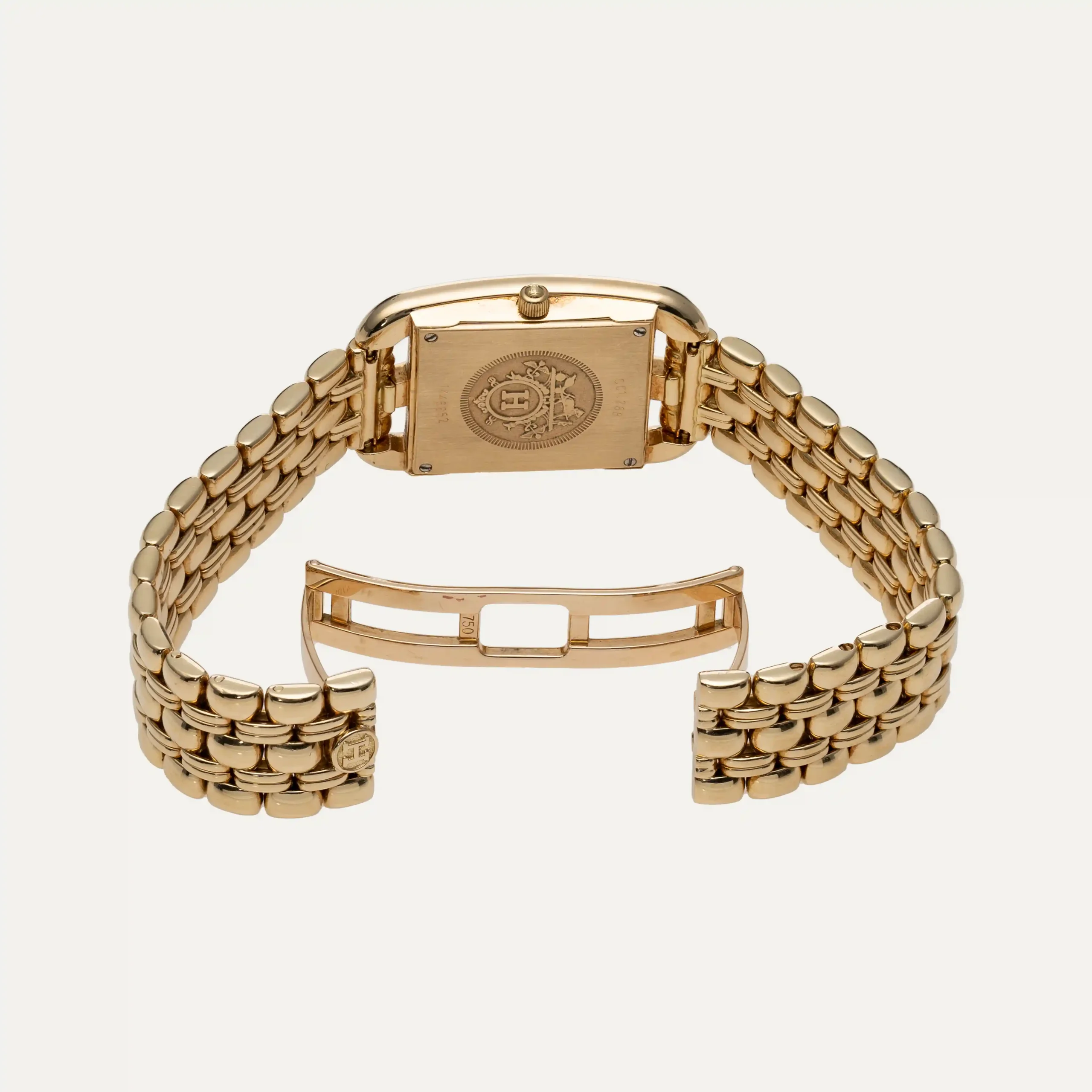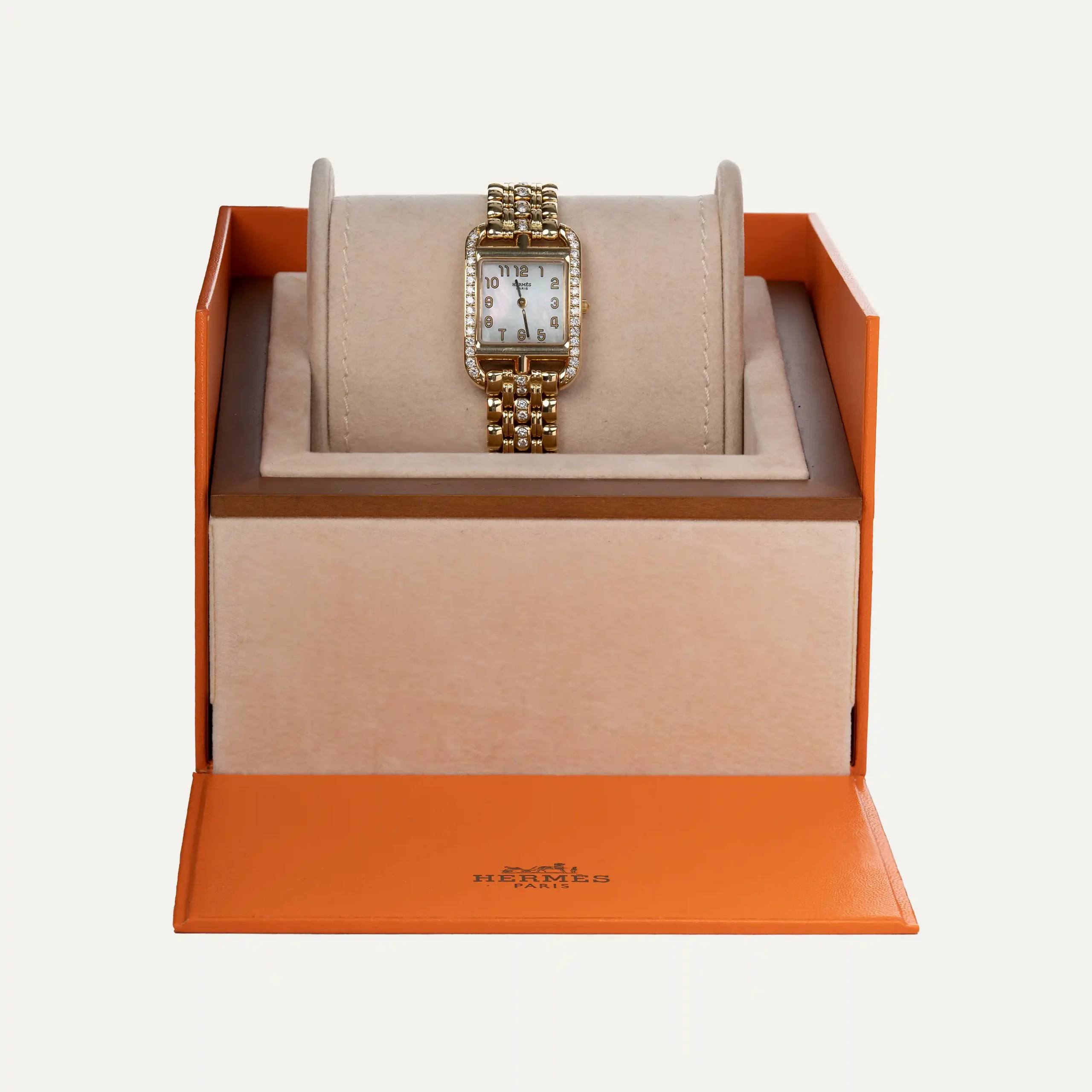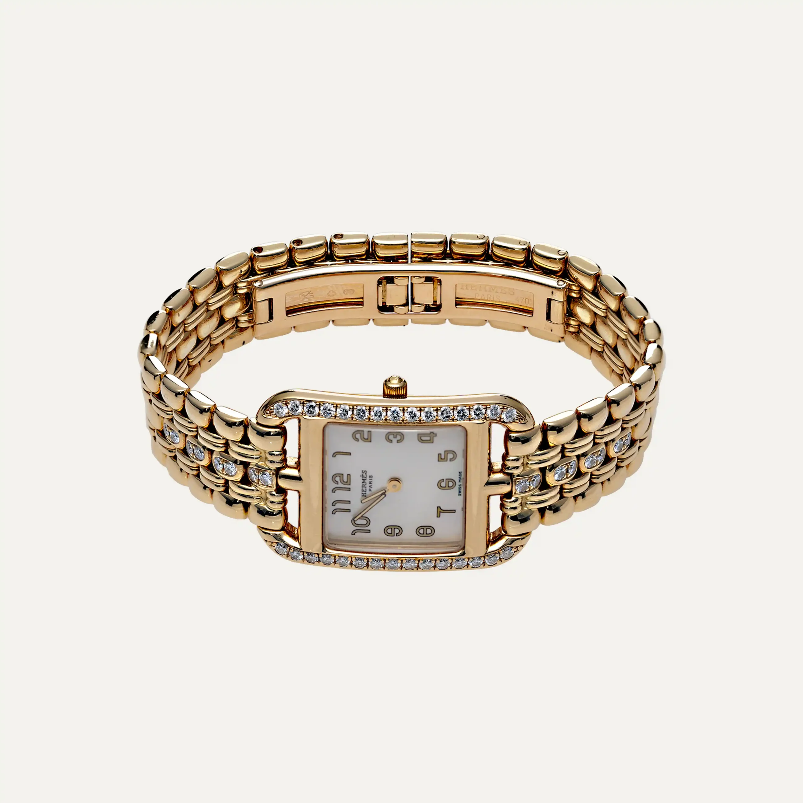 Relógio Hermès Cape Cod, movimento quartzo. Caixa em ouro amarelo 18kt – 750‰, com 23mm x 23mm e espessura 6,6mm. Luneta cravejada com 30 diamantes, mostrador em madrepérola branco e numeração árabe. Ponteiros de horas e minutos. Vidro de safira. Bracelete em ouro amarelo com os elos centrais cravejados com 16 diamantes com fecho de báscula dupla oculto. Caixa Hermès e documentos. Este relógio é apoiado pela nossa garantia de um ano.