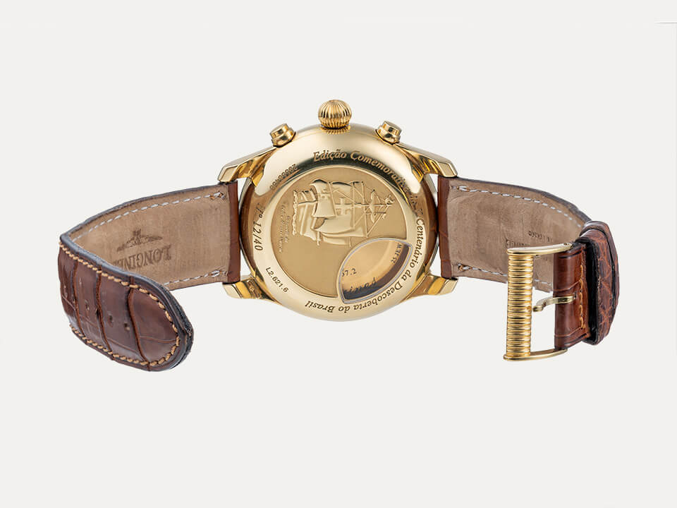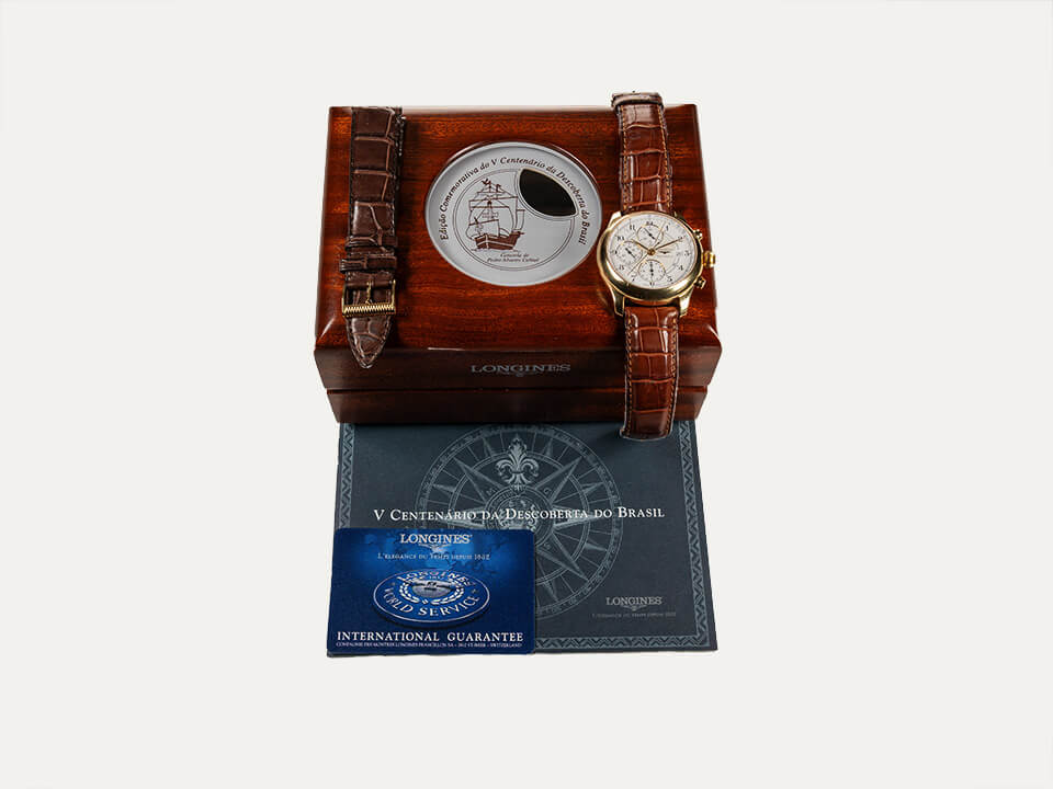 Relógio Longines edição especial e comemorativa do V Centenário da Descoberta do Brasil, limitada a 40 exemplares no mundo, relógio nª12, movimento automático, caixa em ouro, com 41mm de diâmetro e espessura com 13mm. Fundo da caixa com caravela de Pedro Álvares Cabral desenhada a relevo. Mostrador branco, ponteiros horas e minutos, algarismos árabes. Data às 3 horas, cronografo e escala taquimétrica. Reserva de marcha de 44 horas Bracelete em pele de corcodilo camel com fivela em ouro Longines. Com bracelete extra castanha. Caixa Longines e documentos. Este relógio é apoiado pela nossa garantia de um ano.