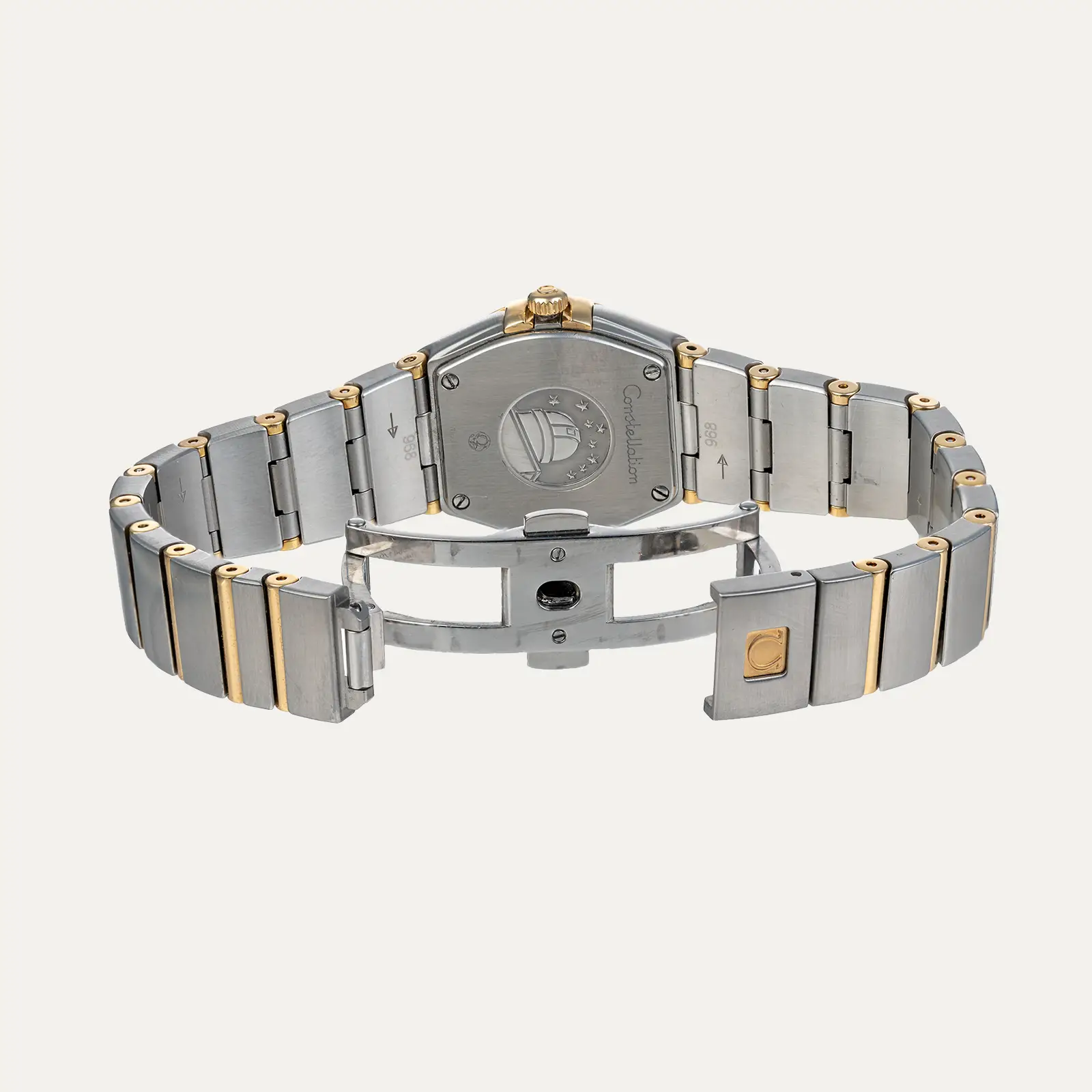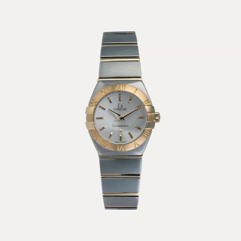Relógio Omega Constellation, movimento quartzo. Caixa em ouro amarelo 18kt – 750‰ e aço, com 24mm de diametro e espessura 8,1mm. Mostrador em prata com index. Ponteiros de horas e minutos. Vidro safira. Bracelete em aço e ouro amarelo, fecho de báscula dupla oculto. Caixa Omega e documentos. Este relógio é apoiado pela nossa garantia de um ano.