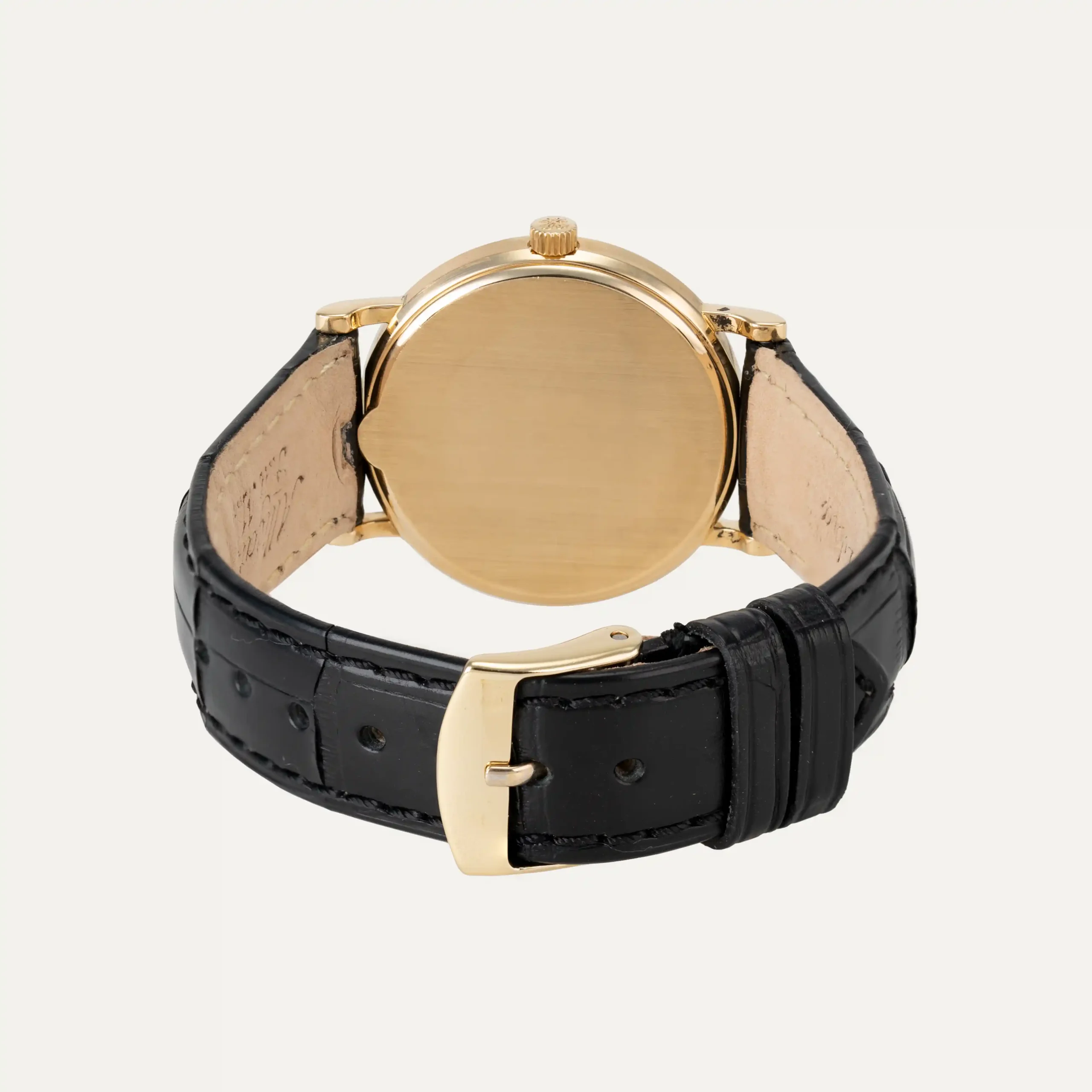 Relógio Patek Philippe Calatrava em ouro amarelo 18 kt – 750 ‰, com 33 mm de diâmetro e 8 mm de espessura. Equipado com movimento automático e uma reserva de marcha de 48 horas. Apresenta bisel em motivo “Clous de Paris”, mostrador branco com algarismos romanos, ponteiros centrais de horas, minutos e segundos, e data às 3 horas. A coroa tem o logótipo Patek Philippe e o vidro é em cristal de safira.