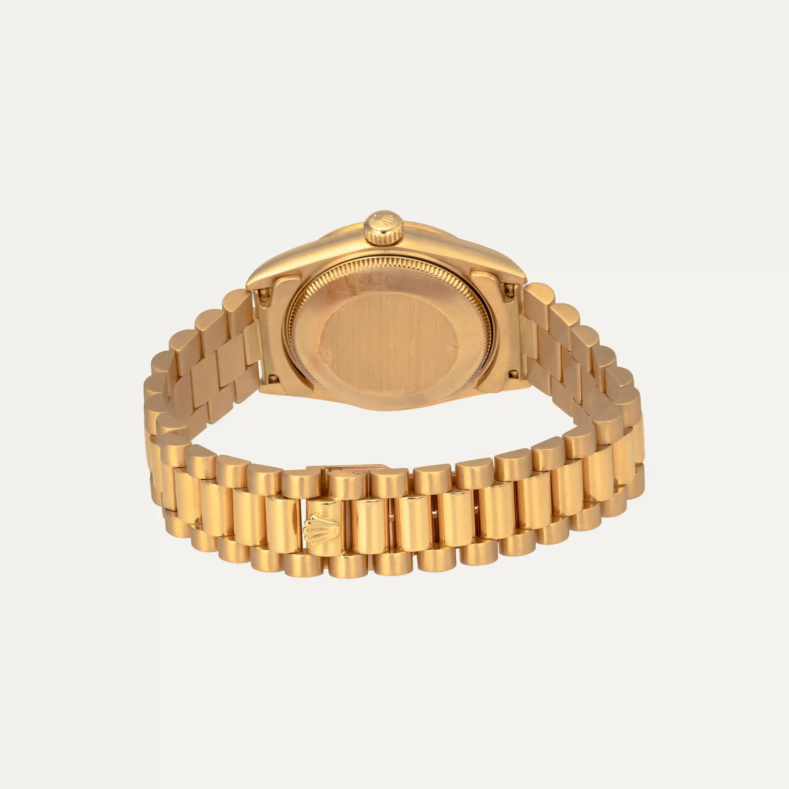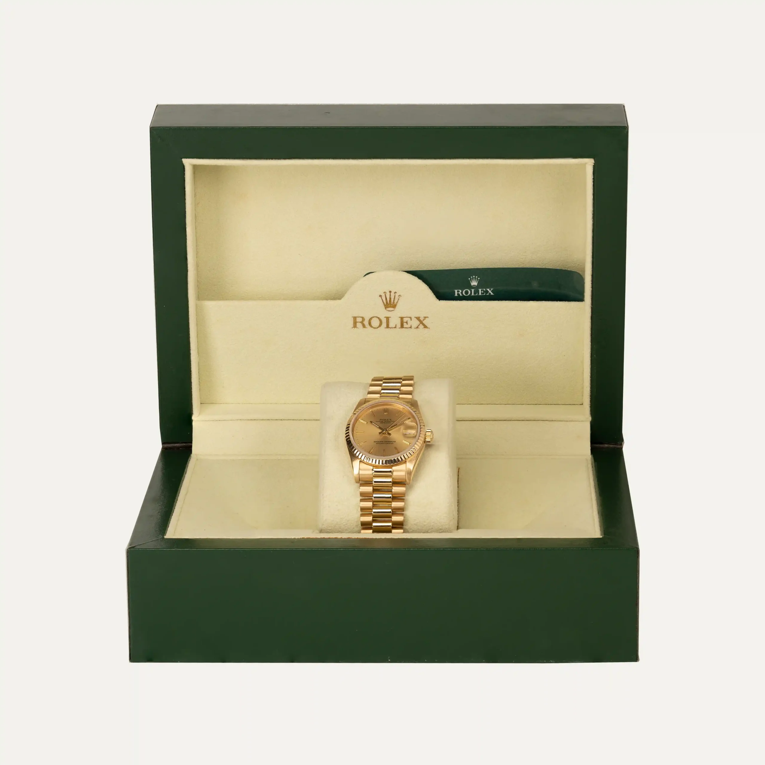Relógio Rolex Datejust, movimento automático, com 31mm de diâmetro e espessura 11mm. Caixa em ouro amarelo 18kt – 750‰, luneta canelada em ouro, mostrador dourado com index, ponteiros de horas, minutos e segundos, data às 3 horas. Coroa de rosca com logótipo Rolex. Vidro de safira. Bracelete em ouro com fecho de báscula. Caixa Rolex. Certificado “The Watch Register” e “Garantia internacional de serviço”. Este relógio é apoiado pela nossa garantia de um ano.