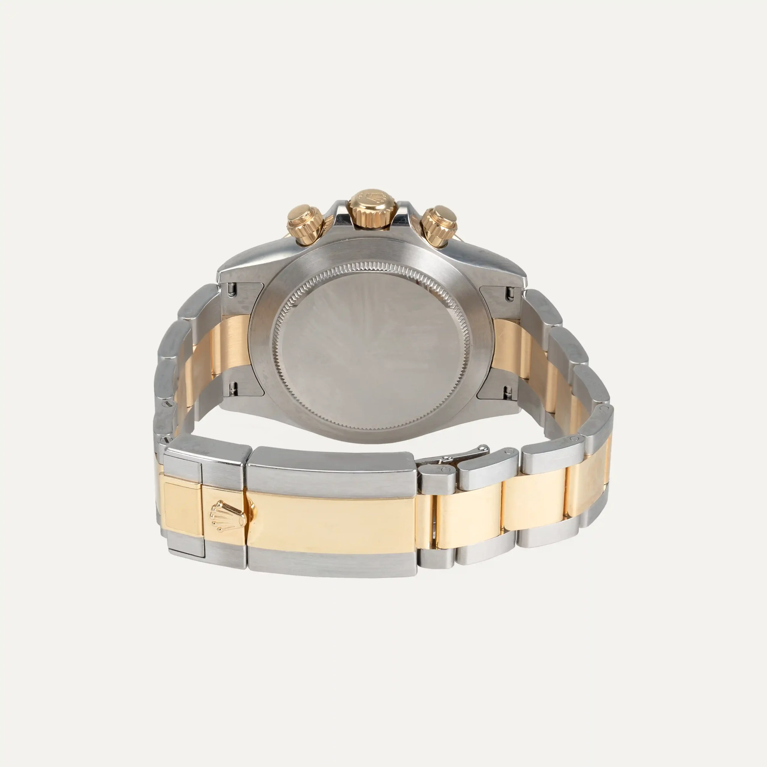 Relógio Rolex Daytona cronógrafo, movimento automático, caixa em aço e ouro com 40mm de diâmetro e espessura 12.4mm. Mostrador branco com índex luminescentes. Ponteiros luminescentes de horas e minutos. Cronografo e escala taquimétrica. Coroa de rosca com reserva de marcha de 72 horas. Vidro de safira. Bracelete em aço e ouro com fecho de báscula. Contém dois elos suplentes. Certificado COSC e certificado “The Watch Register”. Caixa Rolex e documentos. Com garantia da Rolex válida até 2026.