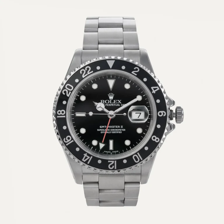 Relógio Rolex GMT-Master II, movimento mecânico de corda automática, caixa em aço, com 40 mm de diâmetro e espessura 12 mm. Mostrador preto com índex luminescentes. Luneta bidirecional giratória graduada 24 horas. Disco em alumínio preto. Ponteiros luminescentes de horas, minutos e ponteiro GMT, data às 3 horas. Coroa de rosca com reserva de marcha de 48 horas. Vidro de safira. Bracelete em aço e fecho de báscula. Certificado COSC. Caixa Rolex e documentos. Cerificado “The Watch Register”. Este relógio é apoiado pela nossa garantia de um ano.