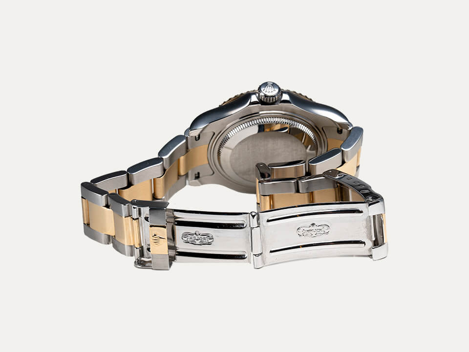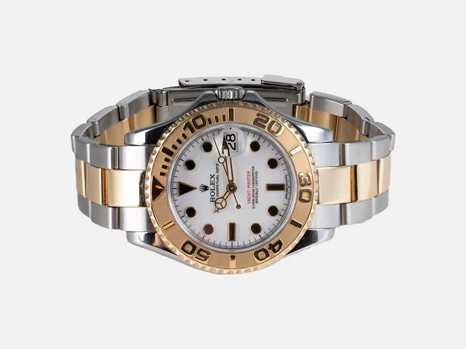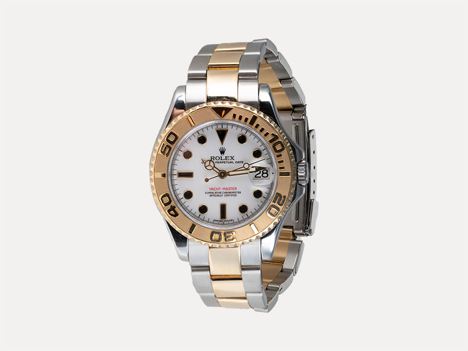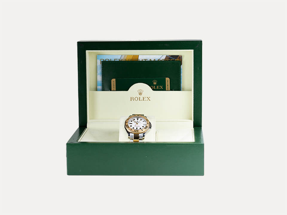 Relógio Rolex Yacht-Master, movimento automático, caixa em ouro amarelo 18kt – 750‰ e aço, com 35mm de diâmetro e espessura 12mm. Caixa em aço com bisel em ouro amarelo 18kt – 750‰, mostrador branco com índex, ponteiros luminescentes de horas, minutos e segundos, data às 3 horas. Coroa de rosca com reserva de marcha de 48 horas. Vidro de safira. Bracelete em ouro amarelo 18kt – 750‰ e aço fecho de báscula. Certificado COSC. Contém um elo suplente. Caixa Rolex e documentos. Este relógio é apoiado pela nossa garantia de um ano.