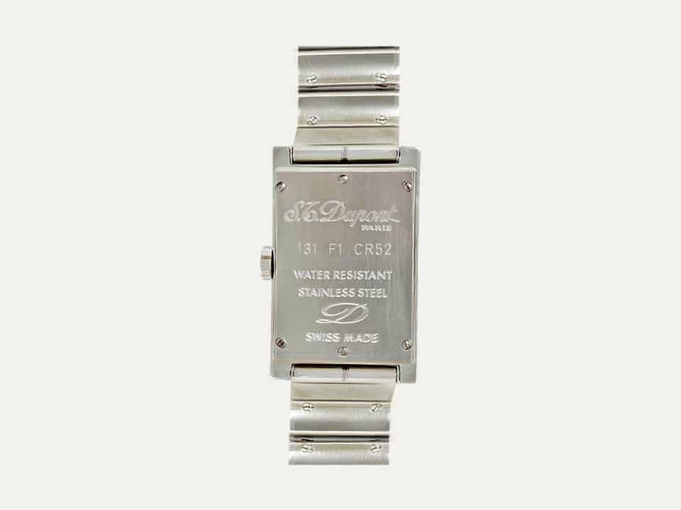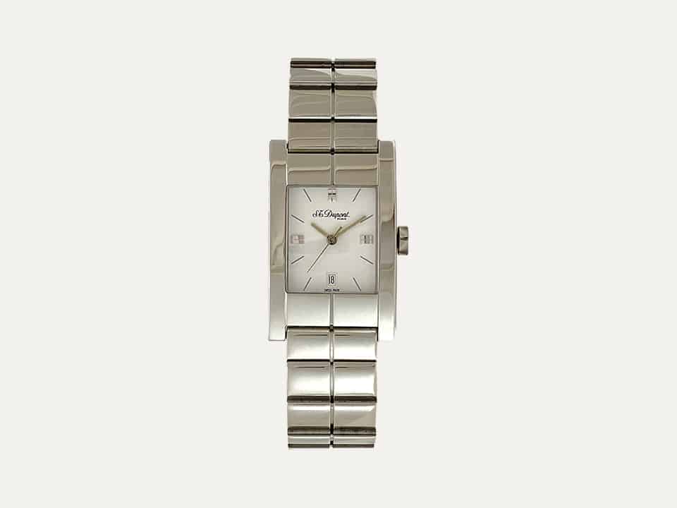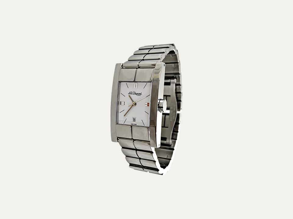 Relógio de pulso unisexo S.T. Dupont Geometrie em aço inoxidável. Caixa retangular e movimento de quartzo. Mostrador branco e calendário às 6 horas. Bracelete em aço inoxidável. Este relógio é apoiado pela nossa garantia de um ano.