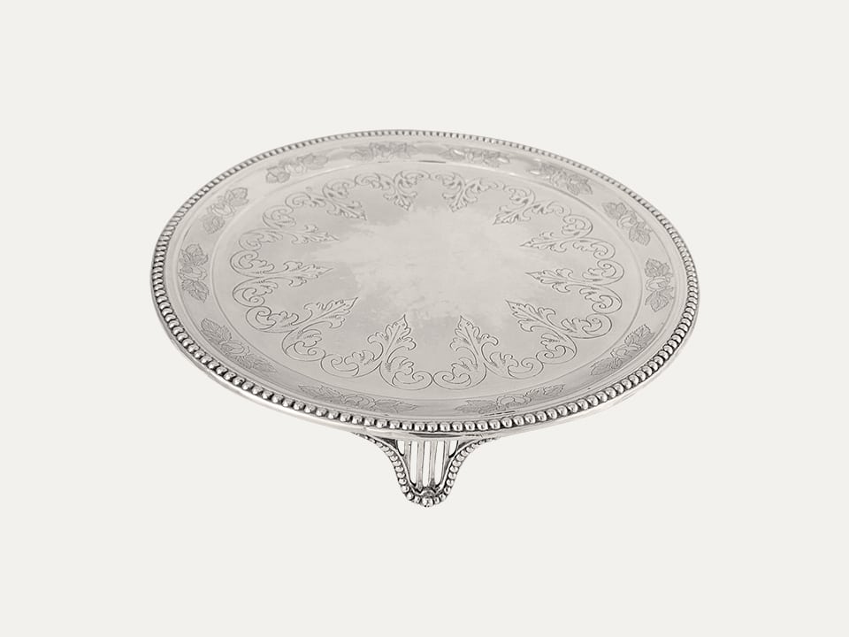 Salva bilheteira antiga, com 3 pés, em prata perlada