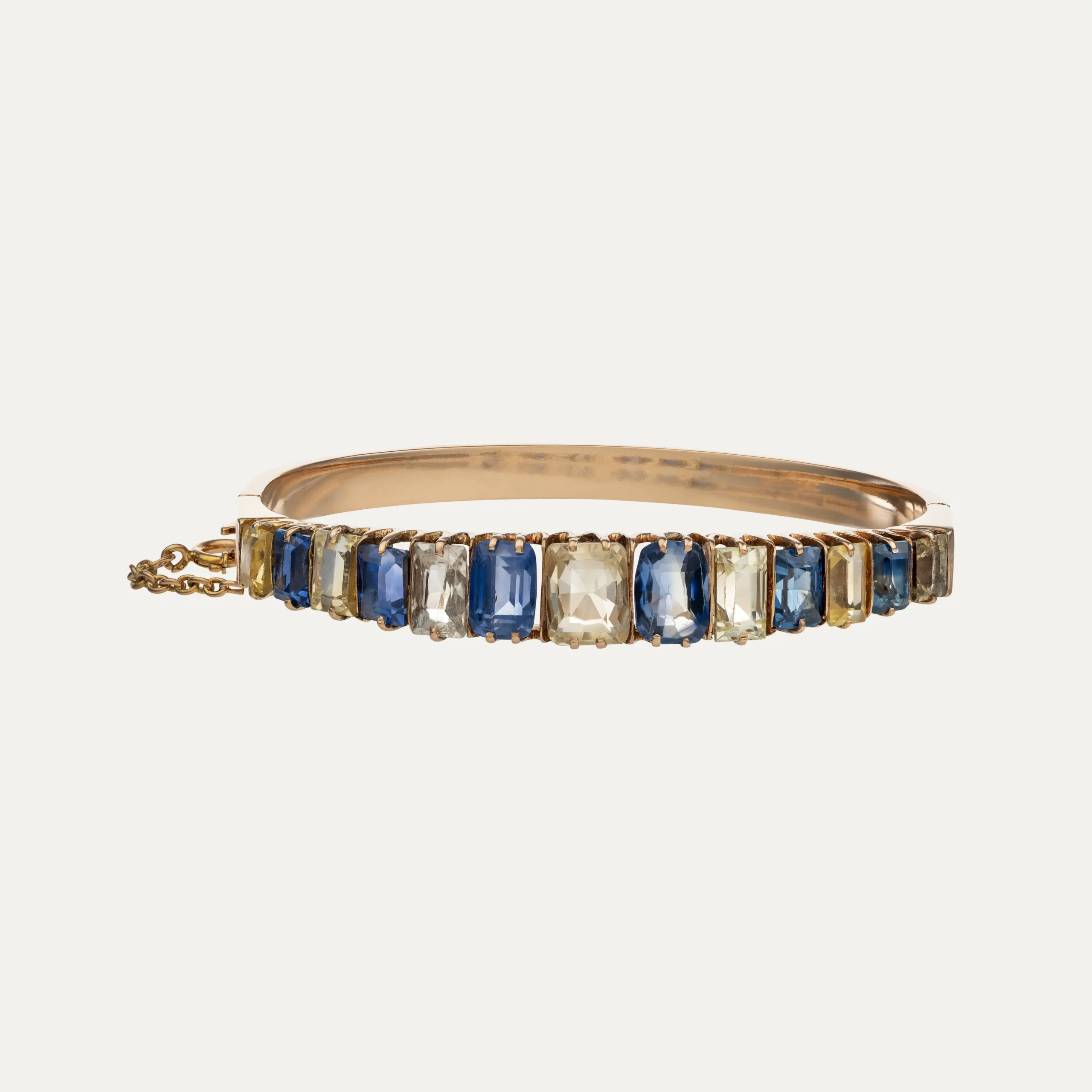 Pulseira rígida, ouro amarelo de 19.2 kt – 800 ‰, cravejada com 6 safiras azuis e 7 amarelas que totalizam cerca de 16,8 ct. Com 6 cm de diâmetro interno e corrente de segurança. Portuguesa, com contraste de Lisboa (1938-1984) e marca de ourives ilegível.